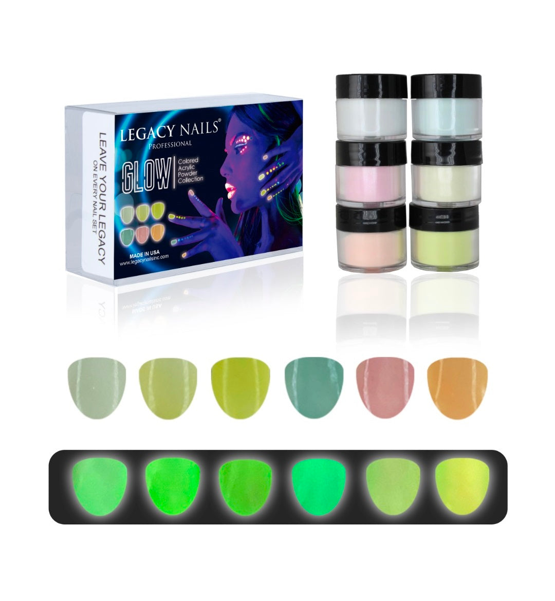 GLOW is a colored acrylic collection with pigments that glow in the dark! Each color performs perfectly with LEGACY NAILS products and provides amazing results.
